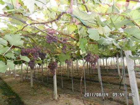 The product is made of excellent PE and imported functional additives by three-layer co-extrusion blow molding with IBC system. The utility model has the advantages of long service life, remarkable flow drop effect, high light transmittance, high temperature resistance, etc. . At the same time, according to the needs of grape growth, the use of a selective light through the different wavelength of auxiliaries, can make grapes bright color, full fruit, sweetness increased. Service Life ≥12 months (thickness ≥0.06 mm film) , flow retention ≥3 months, light transmittance ≥85% , fog ≤35% .